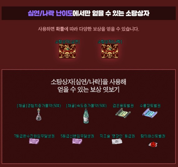 이 소탕상자에서는 경험치 증가 물약, 속도증가물약, 검은용토벌권, 수룡장토벌권, 7등급환수진화임무달성권, 5등급신변임무달성권등 다양한 아이템을 획득이 가능하니 심연, 나락 난이도도 도전해보시면 좋을 것 같습니다.