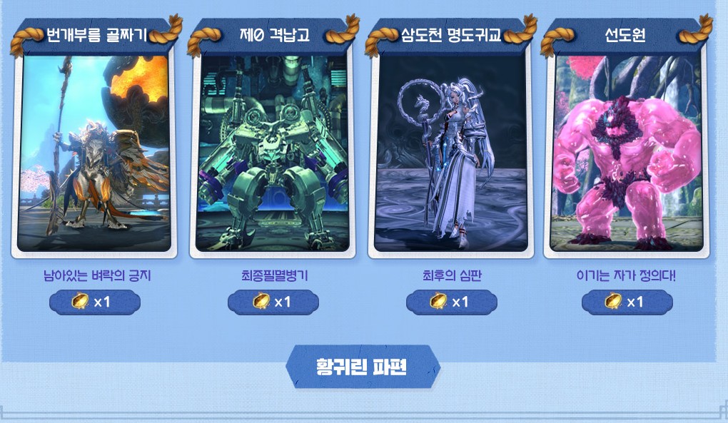 PC방에서는 어느정도 제한이 있는데요. 위 영웅 던전 7종에서 획득 가능한 추가 보상은 일 최대 통합 4회로, 예를 들어서 그냥 경자년 설 주화 3개를 얻으면 황귀린 파편 1개를 얻을 수 있거나, 아니면 주화를 4개 얻을 수 있다고 생각하시면 되겠습니다.