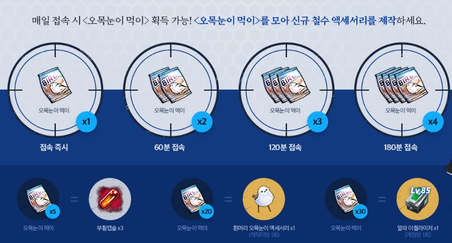 또 사전생성 이벤트와 함께 현재 접속 이벤트도 함께 진행되고 있어요. 김철수가 업데이트 되는 1월 16일까지 매일 접속 즉시/ 60분/120분/180분 접속시에 오목눈이 먹이를 획득해보실 수 있고, 이 오눈먹이 아이템을 모아서 다양한 아이템과 교환이 가능한 이벤트인데요.