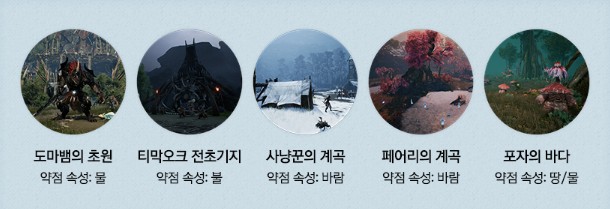 도마뱀의 초원, 티막오크 전초기지, 사냥꾼의 계곡, 페어리 계곡, 포자의 바다 이렇게 총 5가지으 지역이 추가되며, 미리 속성이 중요하다라고 예고했던 것거첨 각 지역마다 물/불/바람/땅에 대한 약점 속성을 가지고 있답니다.