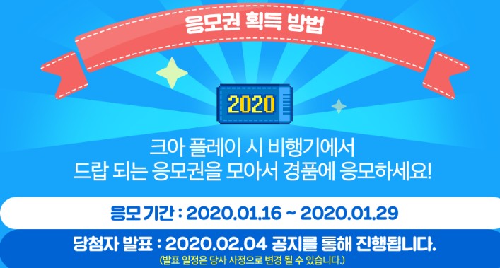 다음은 신년 이벤트에 대해서 알아보도록 할게요. 응모 기간은 2020년 1월 29일까지로 위 설날 이벤트와 겹치기 때문에 해보신다면 참여해보시는 것이 좋을 것 같아요. 크아를 플레이하시다보시면 위에서 비행선이 날라가게 되고 이 비행선이 2020 응모권을 떨구게 되는데요.