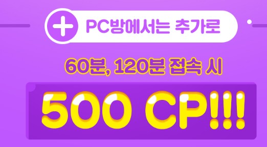 이 CP를 설날 연휴인 1월 24일 ~ 1월 27일까지 일반 집에서는 30분과 60분 접속시에는 200CP를 얻을 수 있고, 추가로 PC방에서 60분, 120분 접속하셨을 경우에는 500CP를 얻어보실 수 있는 이벤트이니 참고하시고 접속하셔서 CP받아보시길 바랍니다.