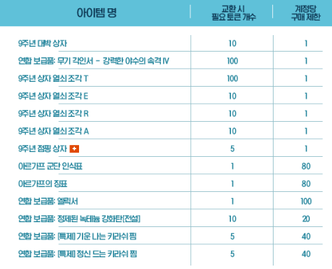 총 13개의 아이템들과 교환이 가능하니, 여러분들의 캐릭터에서 필요로 하는 아이템들을 선택하셔서 토큰으로 교환해보시면 되겠습니다.