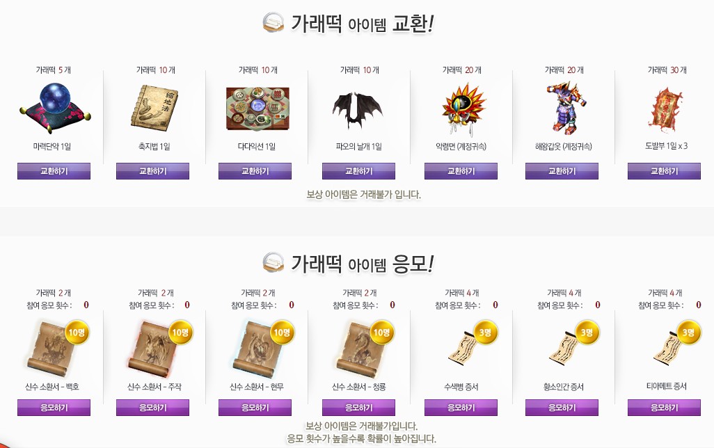 먼저 가래떡 보상먼저 알아보도록 할게요. 가래떡 같은 경우에는 크게 교환 보상과 응모 보상 이렇게 2가지로 나뉘게 되는데요. 교환 보상은 말 그대로 얻으신 가래떡을 사용하셔서 도발부, 해왕 갑옷, 악령면 같은 보상과 교환이 가능합니다.