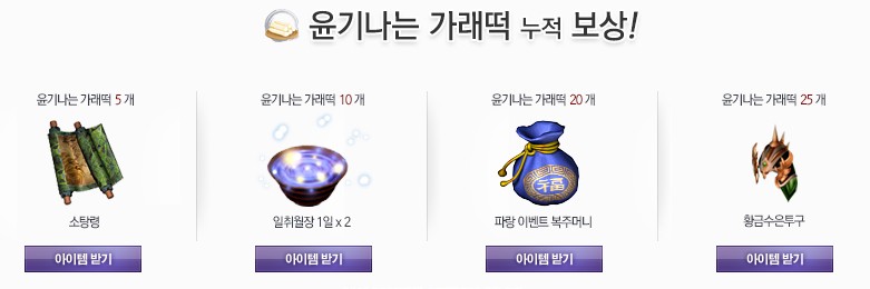 가래떡 외 윤기나는 가래떡도 보상을 받아보실 수 있는데요. 윤기나는 가래떡 같은 경우에는 누적 획득 보상 획득이 가능해요. 윤기나는 가래떡 5개/10개/20개/25개를 획득할 때마다 소탕령, 일취월장, 파랑 이벤트 복주머니, 황금 수은 투그 이렇게 4가지의 보상을 획득해보실 수 있습니다.