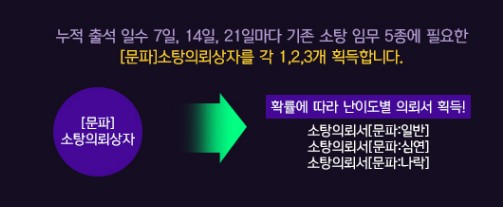 두 번째 혜택은 바로 출석체크 혜택이에요. 문파대리인 NPC에게 하루에 한 번 출석 체크를 하게 되면 황룡성 소탕임무에 필요한 소탕의뢰서를 획득해보실 수 있고, 또 누적 출석 일수 7일/14일/21일마다 기존 소탕 임무 5종이 필요한 소탕의뢰 상자를 획득해보실 수 있답니다.