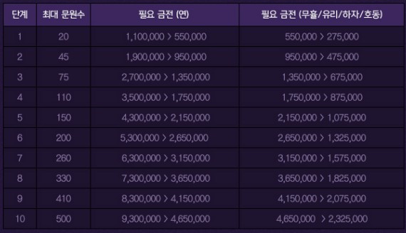 그렇다면 다음으로는 이벤트 혜택에 대해서 알아보도록 할게요. 우선 첫 번째 혜택은 문파 창설 & 확장 비용 할인 혜택이에요. 문파를 창설하고 확장할 수 있도록 문파 대리인을 통한 문파 창설&확장 비용이 반값으로 할인되게 되는데요. 만약 문파를 창설하시거나 확장하실 계획이시라면 이번 기간에 해보시는 것이 좋을 듯 합니다.