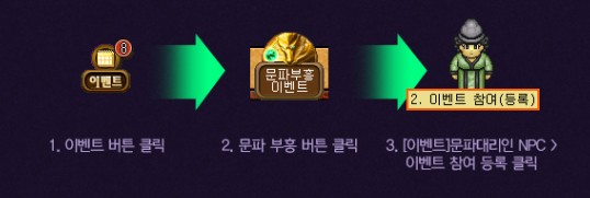 먼저 문파 부흥 이벤트에 참여하시기 위해서는 캐릭터를 들어주셔야 해요. 캐릭터는 이벤트 버튼 → 문파 부흥 이벤트 버튼 →문파대리인 NPC를 클릭하셔서 이벤트 참여 등록을 해야해요.