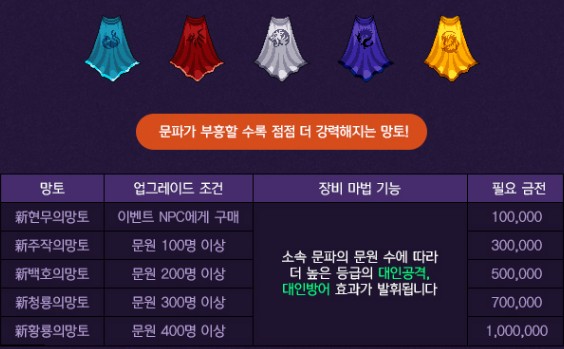 마지막은 문파 전용 신수 망토를 제작해보실 수 있어요. 이벤트 NPC에게서 맨처음 현무 망토를 구입해보실 수 있고, 문파 인원수에 따라서 금전을 지불하고 망토를 업그레이드 시킬 수 있는데요. 이 망토에는 대인 공격과, 대인 방어 효과를 받을 수 있다고 하니 이 점도 참여해보시는 것이 좋을 듯 합니다.