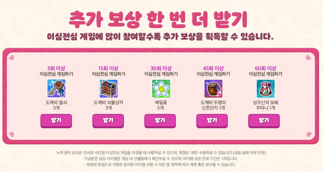 이심전심 게임에 많이 참여할수록 추가 보상을 획득할 수 있습니다.