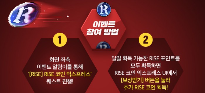 1. 화면 좌측 이벤트 알림이를 통해 RISE 코인 익스프레스 퀘스트 진행!