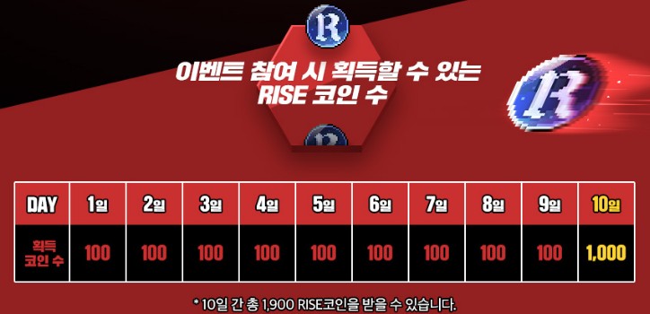 이벤트 참여 시 획득할 수 있는 RISE 코인수는 1일에서 9일차까지 100개씩 받을 수 있고 10일 차에는 1000개를 받을 수 있습니다. 그러니 총 합치면 10일간 1900코인을 받을 수 있습니다.