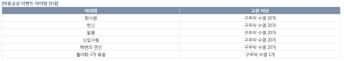 교환비용은 회사원은 구무악 수염 20개, 헌신은 구무악 수염 20개, 달콤, 신입사원, 해변의 연인도 구무악 수염 20개입니다. 월야화 3개 묶음은 구무악 수염 1개가 필요하구요!