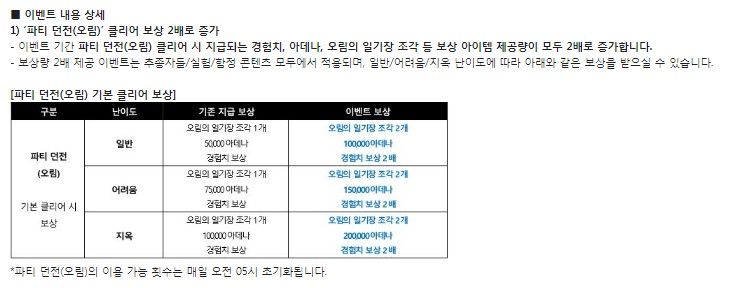 - 파티 던전에서 획득할 수 있는 경험치, 아데나, 오림의 일기장 조각 등 모든 보상이 2배로 제공 된다고 합니다.