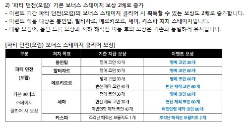 2. '파티 던전(오림)' 기본 보너스 스테이지 보상 2배로 증가하였습니다.