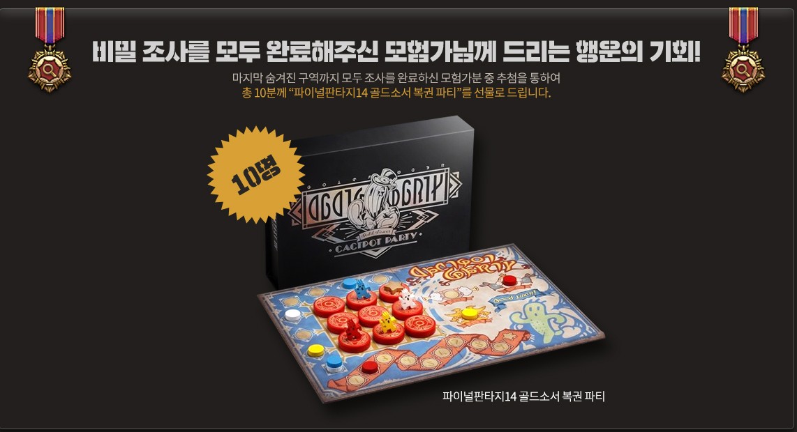 마지막 숨겨진 구역까지 모두 조사를 완료하신 모험가분 중 추첨을 통하여 총 10분께 "파이널판타지14골드소서 복권 파티"를 선물로 드린다고 합니다.!!