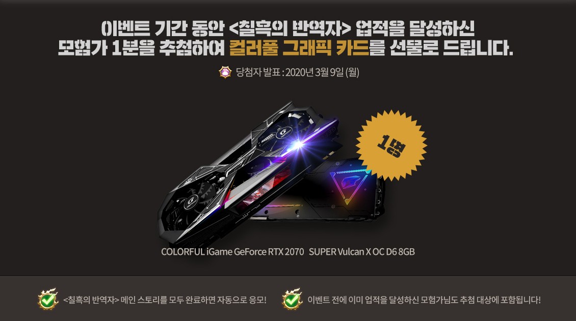이벤트 기간 동안 <칠흑의 반역자> 업적을 달성하신 모험가 1분을 추첨하여 컬러풀 그래픽 카드를 선물로 드린다고합니다. (COLORFUL iGame GeForece RTX2070 SUPER Vulcan X OC D6 8GB)멋있네요,,, 갖고싶습니다.