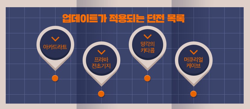 1. 아카드라트, 2. 프라바 전초기지, 3. 망각의 카타콤, 4. 머큐리얼 케이브 이렇게 4가지 던전이 업데이트되었습니다!