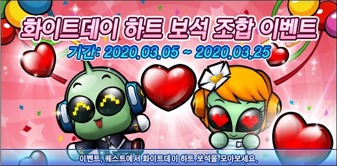 이벤트 기간은 2020년 3월 5일부터 3월 25일까지 이고 화이트 데이 하트 보석을 조합하여 다양한 아이템을 획득할 수 있습니다. 화이트 데이 하트 보석 77개로 연미복 타키 펫(무제한) 또는 웨딩드레스 에리니 펫(무제한)을 획득할 수 있습니다.