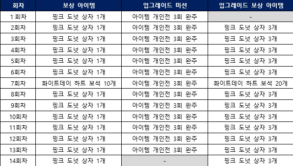 예를 들어서 첫 날 접속 시 '핑크 도넛 상자 1개'를 획득하는데 업그레이드 미션인 '아이템 개인전 3회 완주' 진행을 하게되면 다음날 받게 될 보상 아이템은 핑크 도넛 상자 3개가 됩니다!