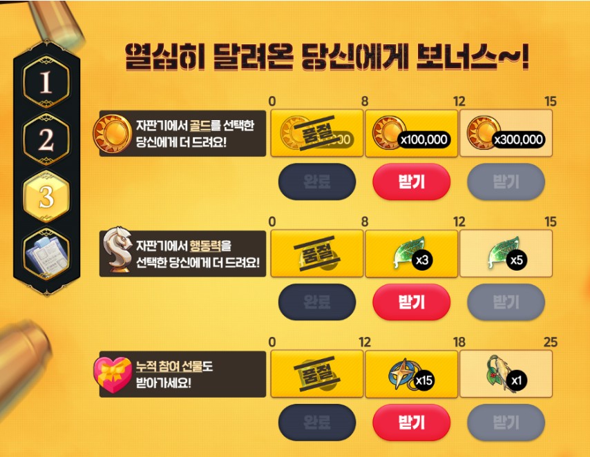 아래의 이미지 처럼 열심히 달려온 당신에게 보너스~ 라고 적혀있으면서 자판기에서 골드를 선택한 유저분들께 골드를 더 주고 자판기에서 행동력을 선택한 유저분들에게 행동력을 더 지급하고, 누적 참여 선물도 받아 가실 수 있답니다.