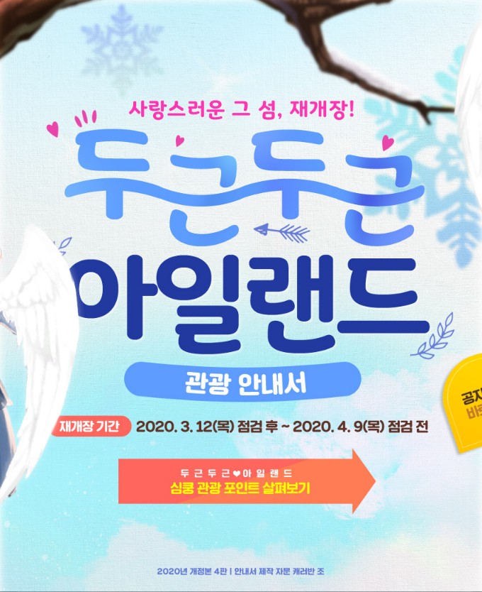 두근 두근 아일랜드는 2020년 3월 12일부터 4월 9일까지 오픈이 됩니다. 추가로 3월 26일에는 오목 미니게임이 추가가 될 예정이구요! 저 오목잘하는데 오목판을 휩쓸어야하나 싶습니다! 그럼 두근두근 아일랜드에 대해서 알아 봅시다!