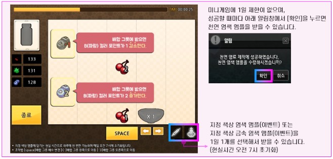 가이드 퀘스트 '천연 염색 이벤트'가 자동으로 지급이 되는데요! 아일랜드에 있는 NPC 천연 염색 도우미와 대화하여 대표 캐릭터를 설정 후 미니게임을 진행하시면 되요! 천연 염색 앰플로 NPC 천연 염색 도우미 주변의 하얀 천들을 염색하면 두근두근 기념상자 1개와 캣츠 소울 3개를 하루 한 번 받을 수 있습니다.