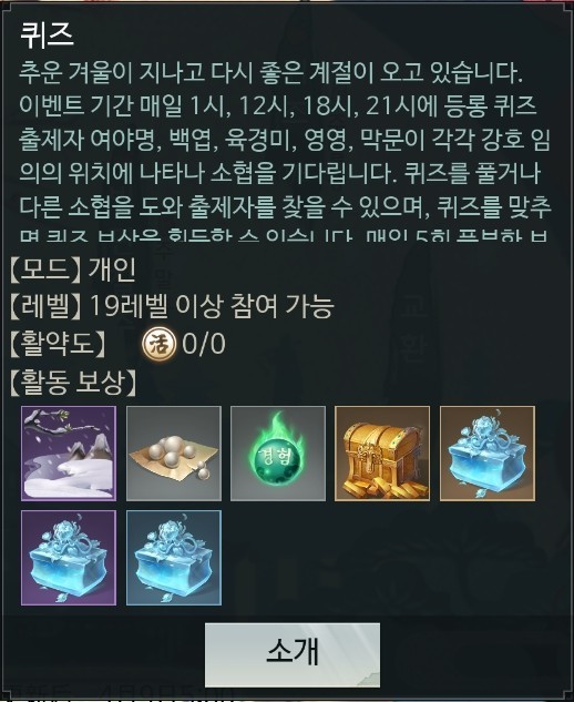 강호 인사 위치에 대한 힌트를 해석하여 강호 인사를 찾으면 퀴즈를 풀 수 있고 보상은 하루 최대 5회까지 획득합니다.