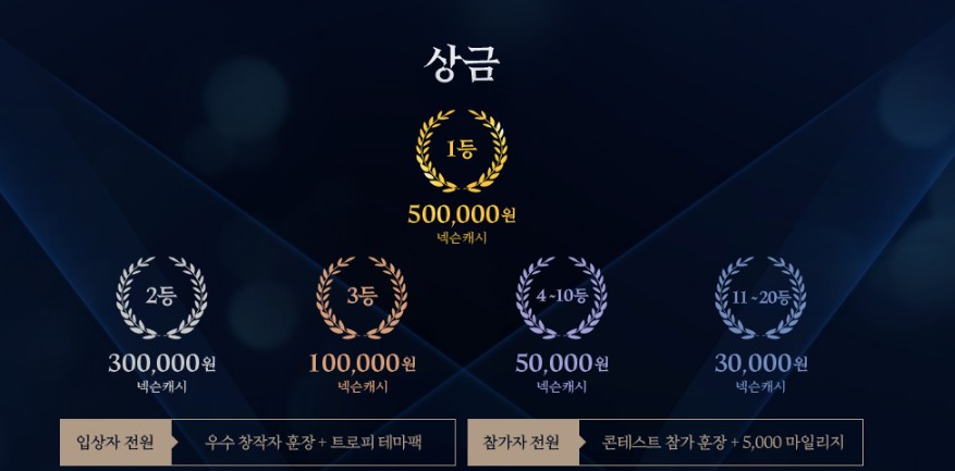 추가로 입상자 전원에게 우수 창작자 훈장 + 트로피 테마팩을 지급하고 참가자 전원에게 콘테스트 참가 훈장 + 5000마일리지를 추가로 지급합니다.