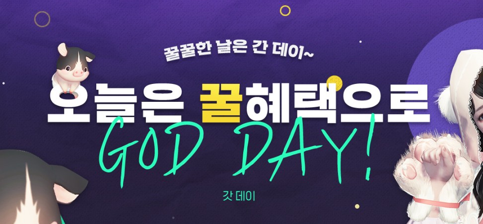 이벤트의 이름은 GOD DAY! 라는 이벤트인데요, 이 이벤트로 <꼬마 돼지> 3종 세트와 꿀보상을 획득할 수 있답니다.