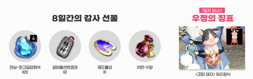 4. 친구의 선물! 7일차 만남 끝에 주소요와 소협은 친구가 되었다고 해요! 우정의 징표로 주소요의 복덩이 <꼬마 돼지>를 받아주시면 됩니다.