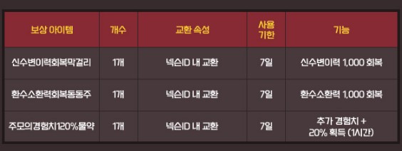 핫타임 한 상 1회 수령 시마다 신수변이력 회복 막걸리, 환수소환력 회복 동동주, 주모의 경험치 120% 물약을 보상 받을 수 있습니다.