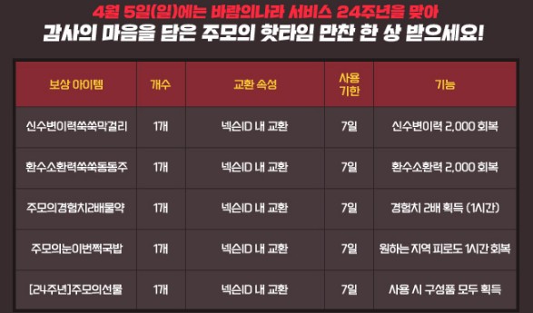 4월 5일에는 바람의 나라 서비스 24주년을 맞아 감사의 마음을 담은 주모의 핫타임 만찬 한 상을 지급해요.