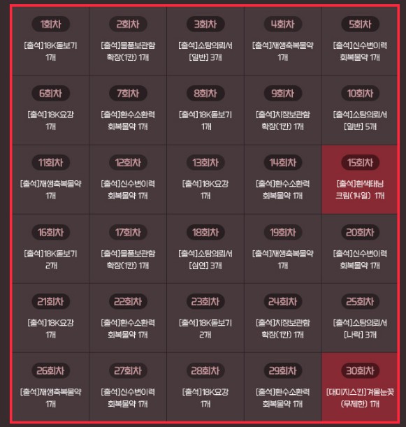 하지만 갑작스럽게 일이 생겨 게임에 접속하지 못해 30일 보상을 모두 받고 싶지만 출석일 수가 모자르다면?