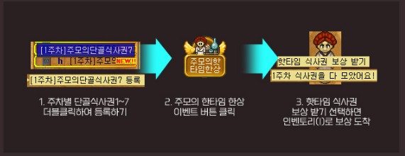 1. 주차별 단골 식사권 1~7 더블클릭하여 등록하기 2. 주모의 한타임 한상 이벤트 버튼 클릭 3. 핫타임 식사권 보상 받기 선택하면 인벤토리로 보상이 도착해요!