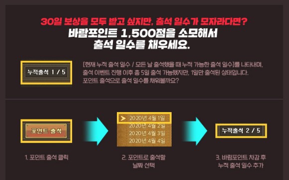 바람포인트 1,500점을 소모해서 출석일수를 채울수 있어요.