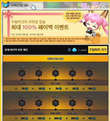 이벤트 기간 동안 모험 레벨 기준으로 1레벨 업하면 5% 페이백, 3레벨 업하면 5% 페이백, 5레벨 업하면 5% 페이백, 7레벨 업하면 5% 페이백, 9레벨 업하면 10% 페이백, 12레벨 업하면 10% 페이백, 15레벨 업하면 10% 페이백, 19레벨 업하면 20% 페이백, 23레벨 업하면 20% 페이백, 28레벨 업하면 10% 페이백을 돌려 받습니다.