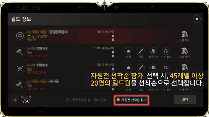 선착순 참가는 관리자가 직접 선발하지 않고, 자원전에 참여를 원하는 길드원 20명을 선착순으로 참여하게 할 수 있죠.