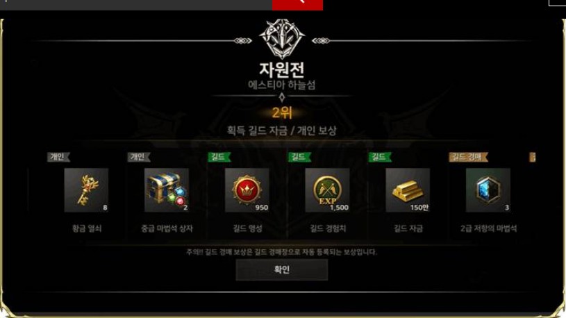 자원전에 참여 시, 개인 보상뿐만 아니라 길드 명성, 길드 경험치, 길드 자금 등 각종 길드 재화와 길드 경매장에 등록되는 다양한 아이템을 획득할 수 있습니다.