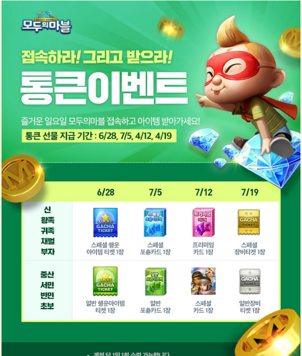 즐거운 일요일에 모두의마블을 접속하시면 아이템을 받아 가실 수 있습니다!