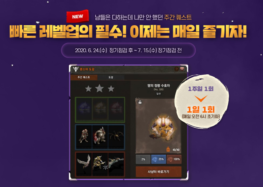 주간 퀘스트가 이벤트 기간동안 1주일에 1회 였는데 , 1일에서 1회로 변경 되었습니다. 매일 오전 6시 초기화가 됩니다.