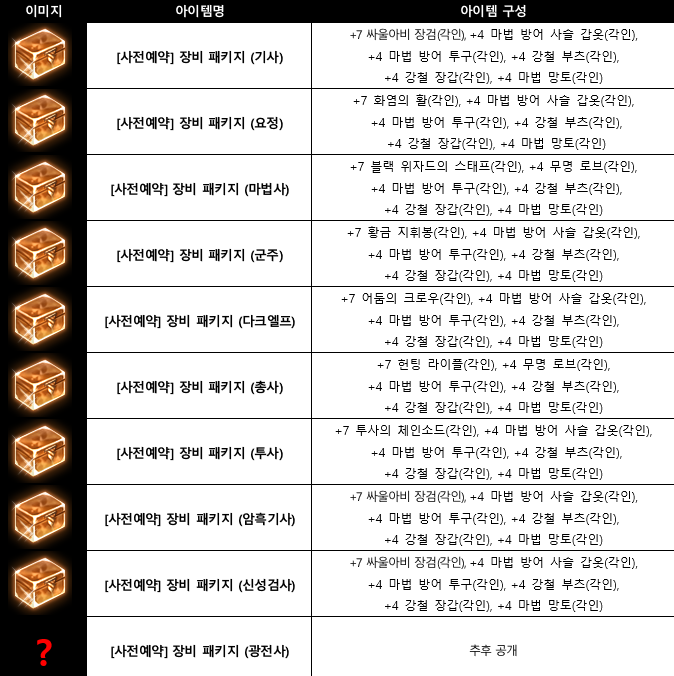 장비 패키지 (기사) - 7싸울아비 장검, 4마법 방어 사슬 갑옷, 4 마법 방어 투구, 4 강철 부츠, 4 강철 장갑, 4마법 망토