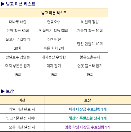 세 번째 이벤트는 다양한 빙고 미션을 완료 하시면 희귀 태장금 수호신령과 해신의 특별소환 상자,