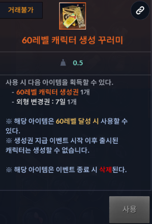 60레벨 캐릭터 생성권 상자를 사용 시