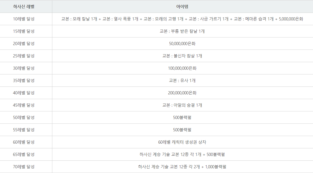 65레벨 달성 -하사신 계승 기술 교본 12종 각 1개 +500블랙펄
