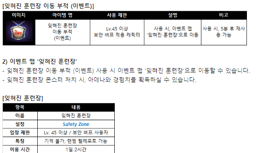 잊혀진 훈련장은 45레벨 이상 보안버프 적용 캐릭터만 가능하고,