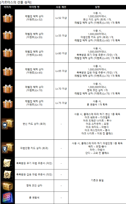 기르타스의 선물 상자에서 획득한 레벨업 혜택 상자 사용 시 , 다양한