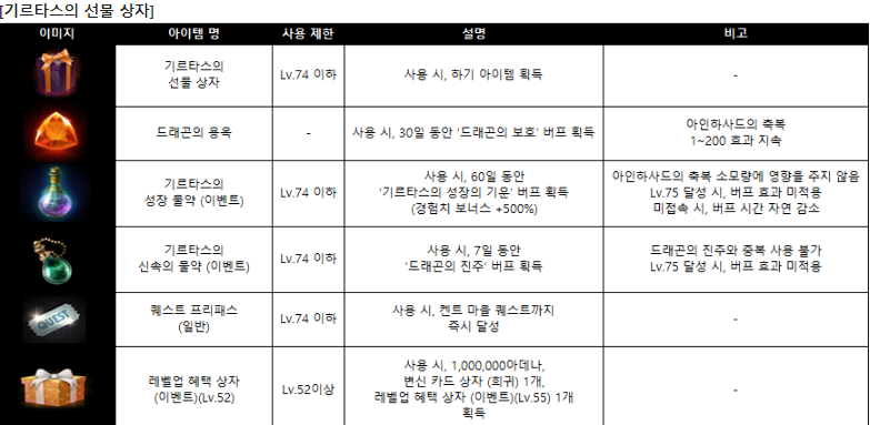 기르타스의 선물 상자 사용 시 , 성장에 도움을 주는 다양한 아이템을 획득할 수 있다고 합니다.