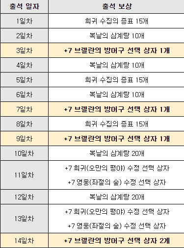 이벤트 기간 동안 게임에 접속하시면 일차 별 특별 출석부 선물을 받으실 수 있습니다.