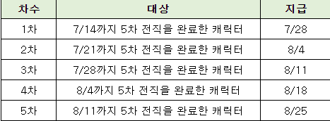 보상은 5차 신규 클래스 전직 캐릭터 수와 관계없이 각 서버, 차수 당 1회씩 지급 한다고 합니다.